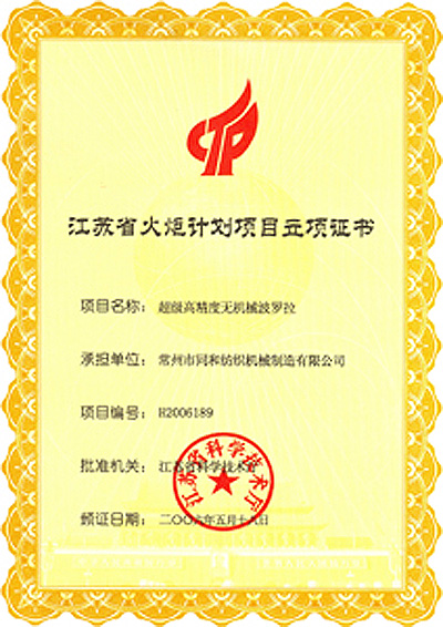 江蘇省火炬計(jì)劃立項(xiàng)證書(超級(jí)高精度無(wú)機(jī)械...